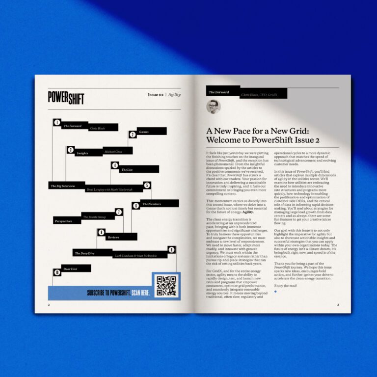 The second issue of PowerShift focuses on the essential theme of agility to help the energy sector navigate the accelerating clean energy transition. Agility is defined as the ability to rapidly design, test, and launch new rates and programs that empower consumers, optimize grid performance, and seamlessly integrate renewable energy sources. It requires moving faster and adopting a dynamic approach that matches the speed of technological advancement and evolving customer needs, while working within the limitations of legacy systems. The issue contains articles exploring multiple dimensions of agility, including innovative rate structures, technology for customer-side Distributed Energy Resources (DERs), the critical role of data in rapid decision-making, and strategies for managing data center load growth.